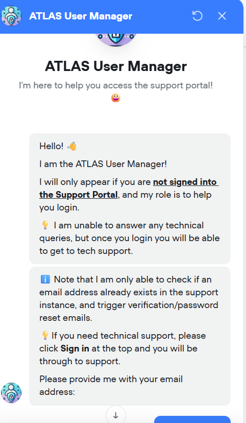 - Use the ChatBot: If you have trouble with email verification or password reset, click on the ChatBot in the bottom corner (Unable to login?). It will guide you through the process.