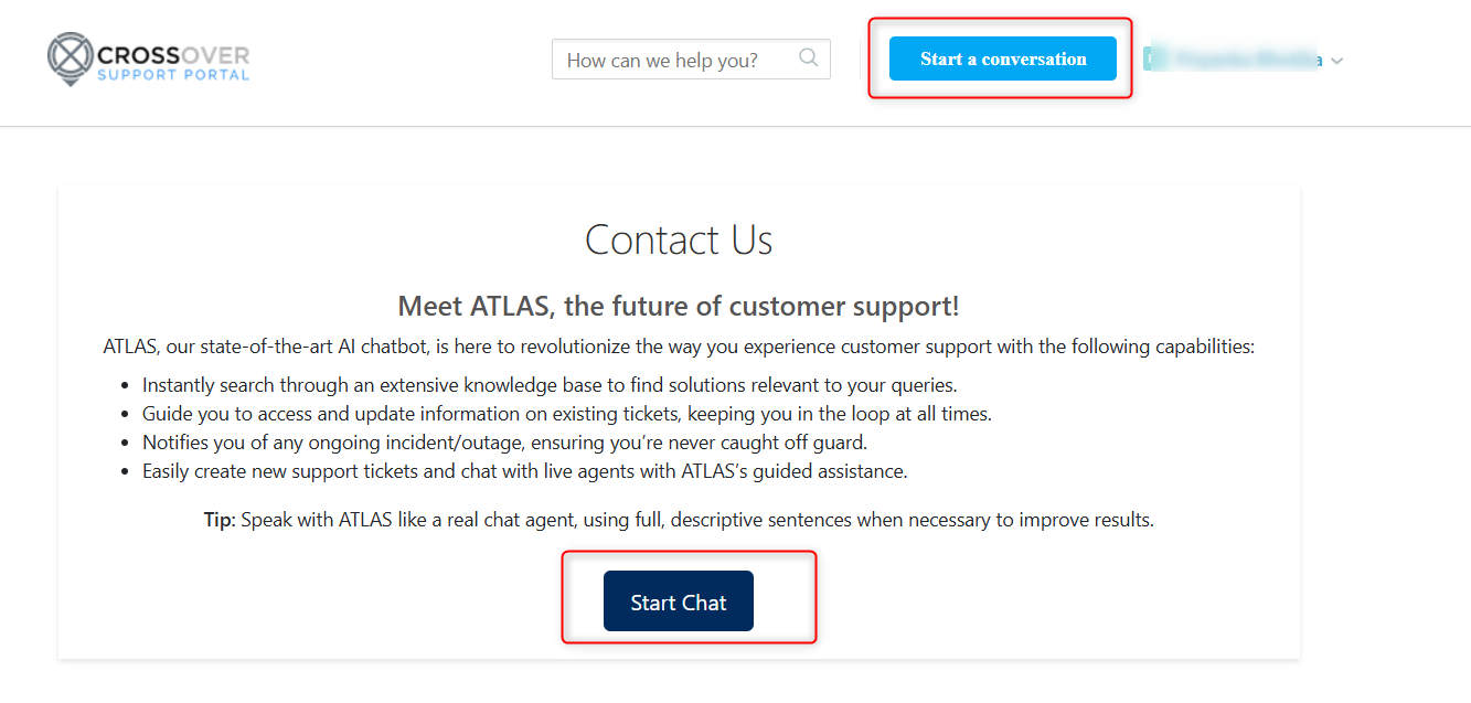- After signing in, click on the chat icon in the bottom right corner or select “Start a Conversation” at the top. A banner for ATLAS will appear; click on “Start Chat” to initiate a session with ATLAS.