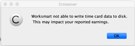 After installing WorkSmart successfully on macOS and once you started tracking time, you may receive the following error message: "Worksmart is not able to write time card data to disk. This may impact your reported earnings.".